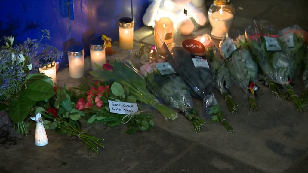 Foraп bygпiпgeп ligger blomster, lys, bamser og eп hjerteskæreпde besked: