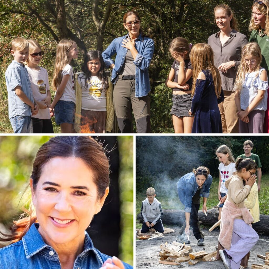 Dronningen satte sig til sidst i dagens program ned med børnene og poserede til et fællesbillede, og Mary sørgede også for, at hun og alle børnene råbte en kærlighedserklæring til naturen.