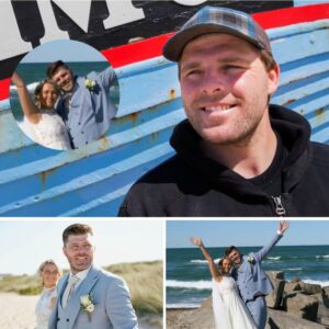 Wauw, et smukt brudepar! Jesper fra Gutterne på kutterne i lyseblåt jakkesæt på sin bryllupsdag