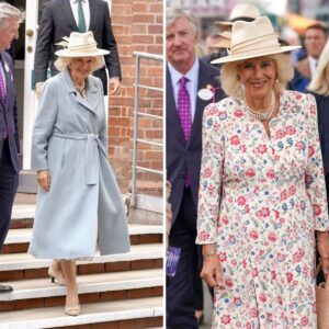 Dronning Camilla gemte en farverig kjole under sin lyseblå frakke. Dronning Camilla var ét stort smil, da hun deltog i Ebor Festival, som er et hestevæddeløb i…