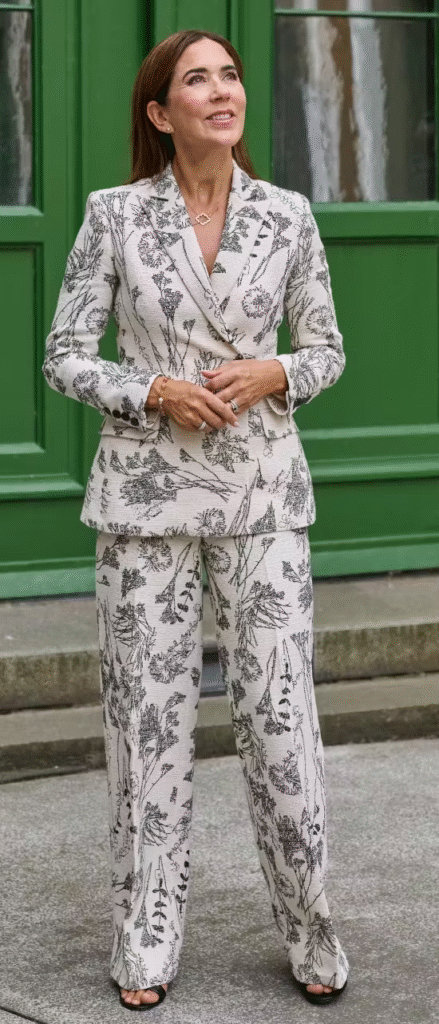 Der gik et sus gennem pressekorpset ved synet af dronningen i et sort og cremefarvet jakkesæt med botanisk print, fordi det var så anderledes og mere markant end de mere ensfarvede jakkesæt, hun normalt viser sig i.