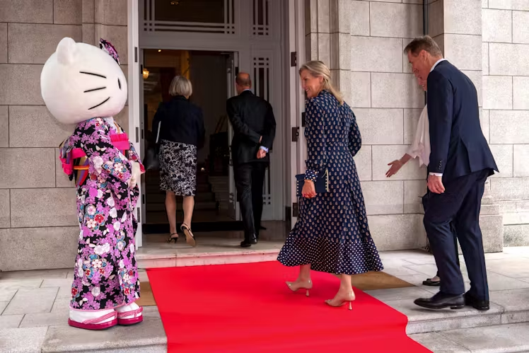 Fredag mødte prins Edward og hertuginde Sophie op ved den britiske ambassade i Tokyo, og her fik de sig et vildt syn. Ingen ringere end Hello Kitty var nemlig mødt op for at tage imod de kongelige gæster.