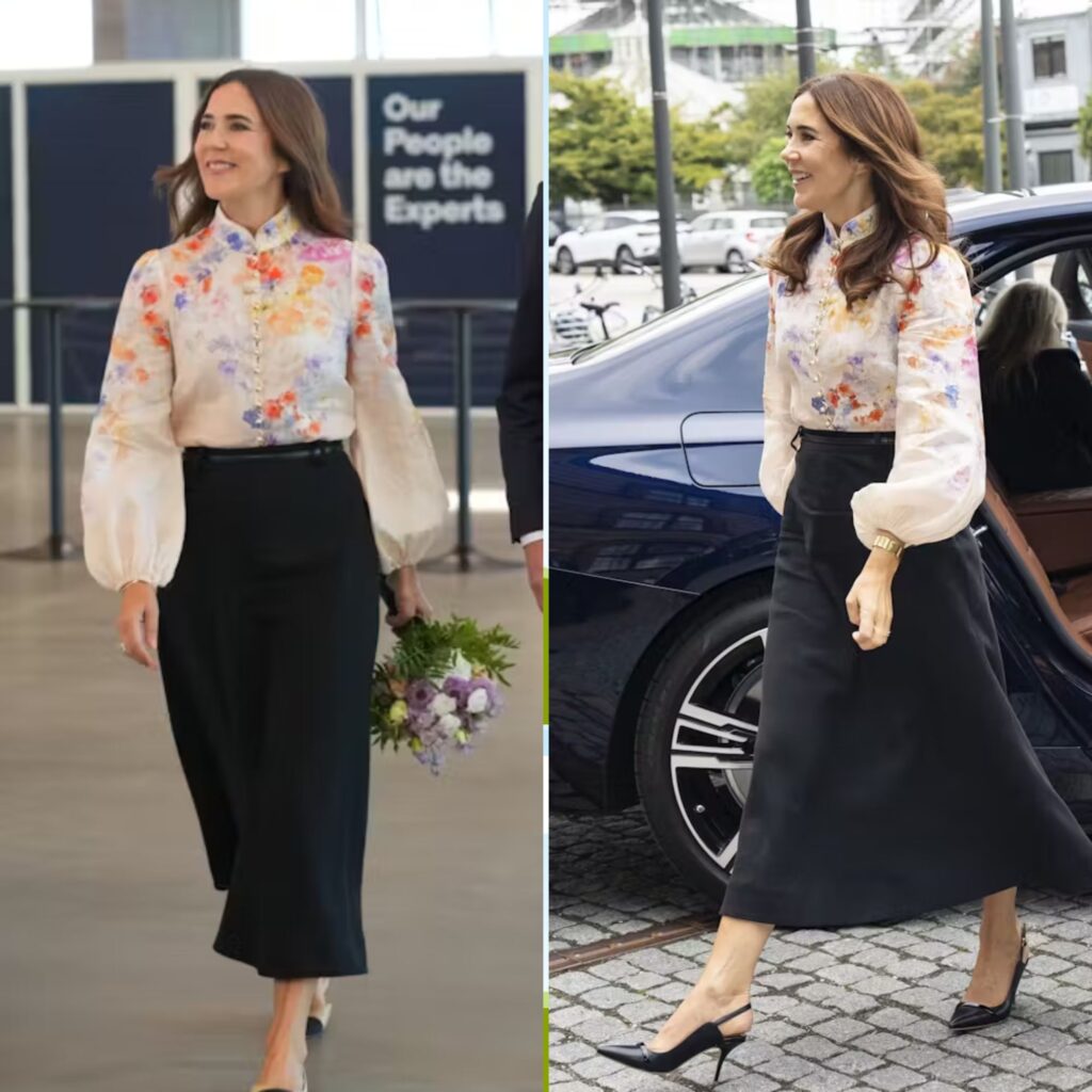 Da dronning Mary i dag besøgte det Samfundsvidenskabelige Fakultet i København, var hun i en sommerlig skjorte, sort nederdel og sorte sko med hæl.Det sker ofte, at dronningen skifter outfit imellem programpunkter i løbet af en dag, men i dag valgte hun at beholde sættet på, da hun senere på dagen stod for at navngive en elektrisk slæbebåd.
