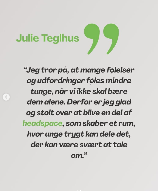 Det betyder meget for os, at hun har lyst til at blive en del af vores stærke ambassadørteam! Sammen glæder vi os til at sætte endnu mere fokus på unges mentale helbred 💪”, skriver Headspace på deres Instagram.