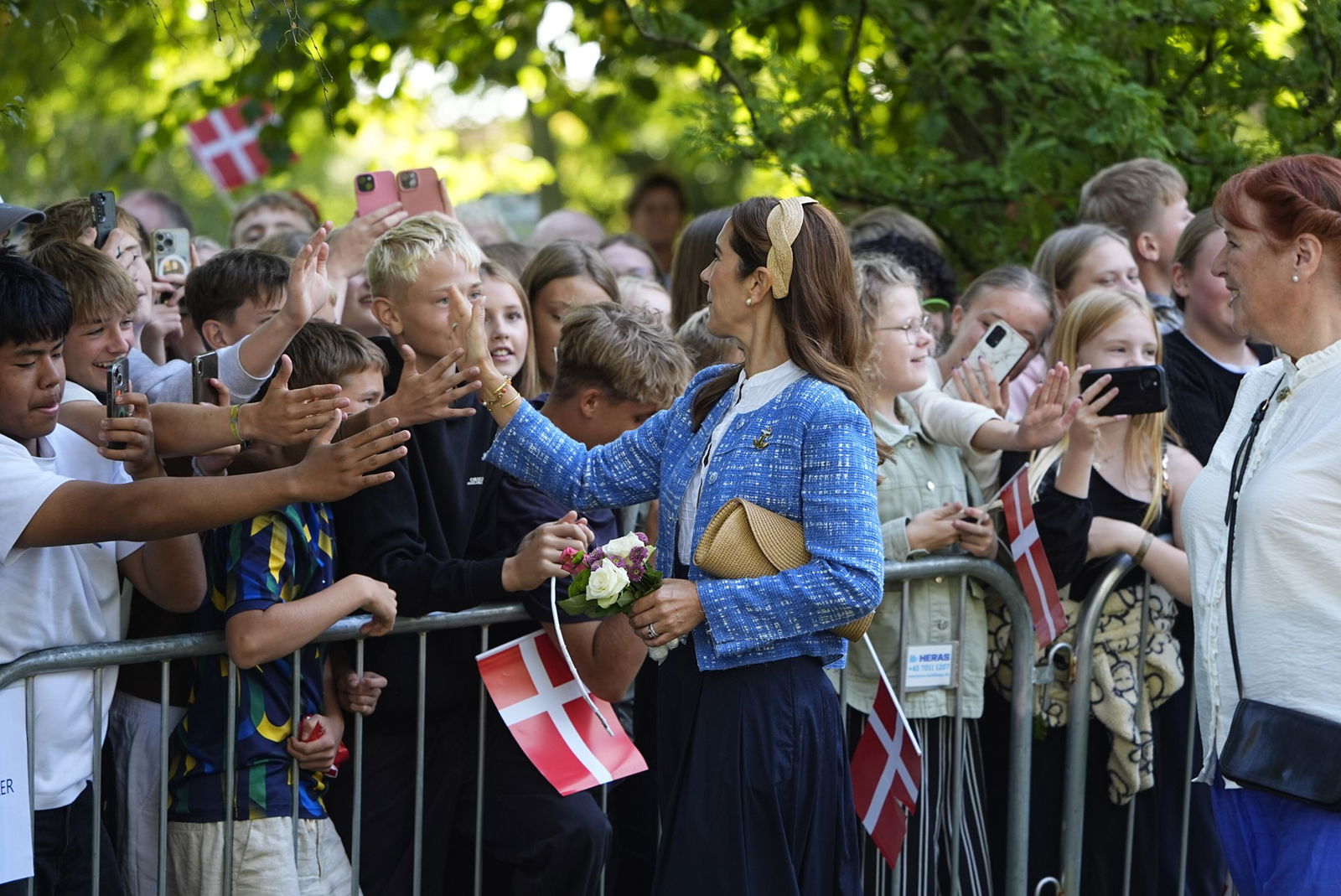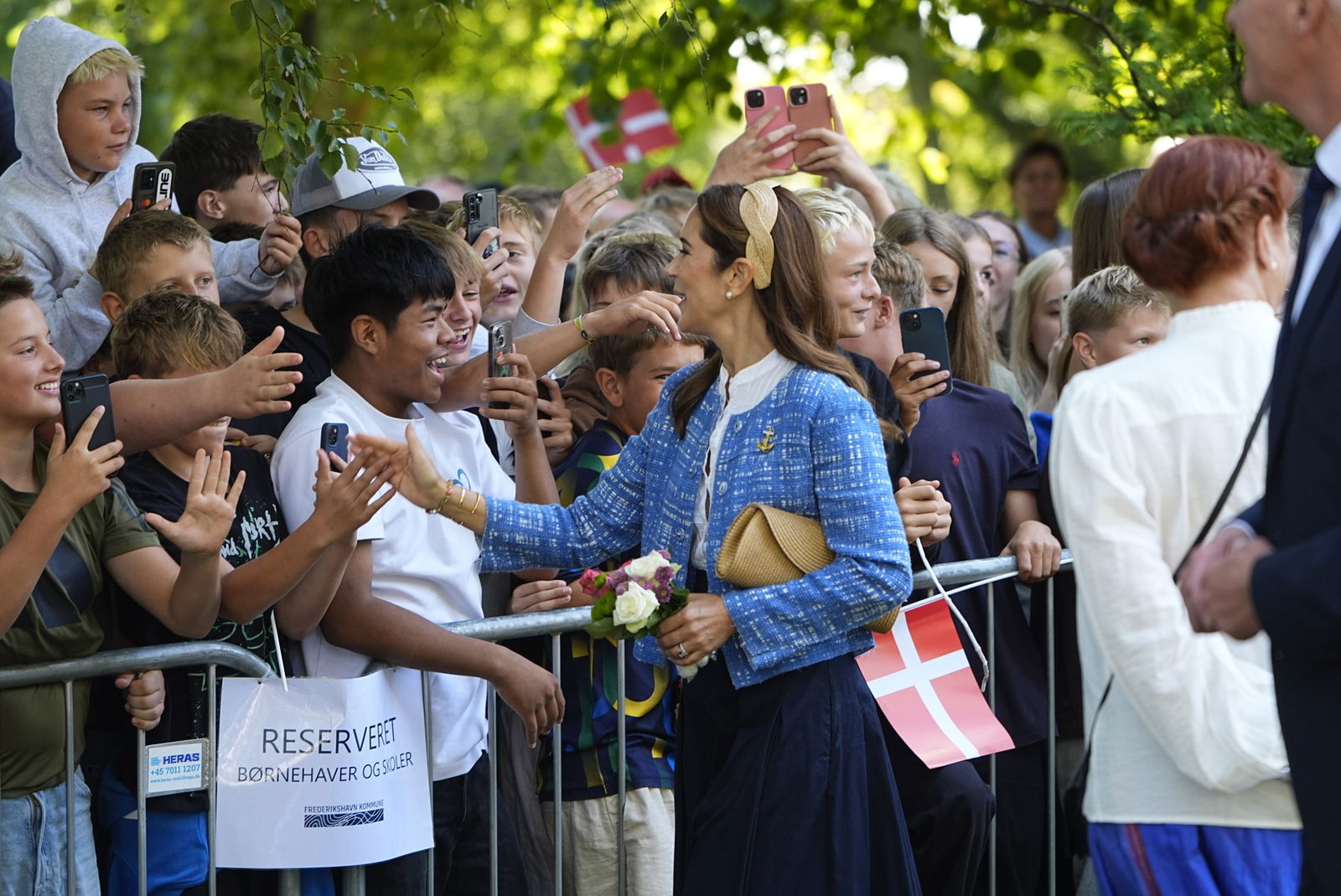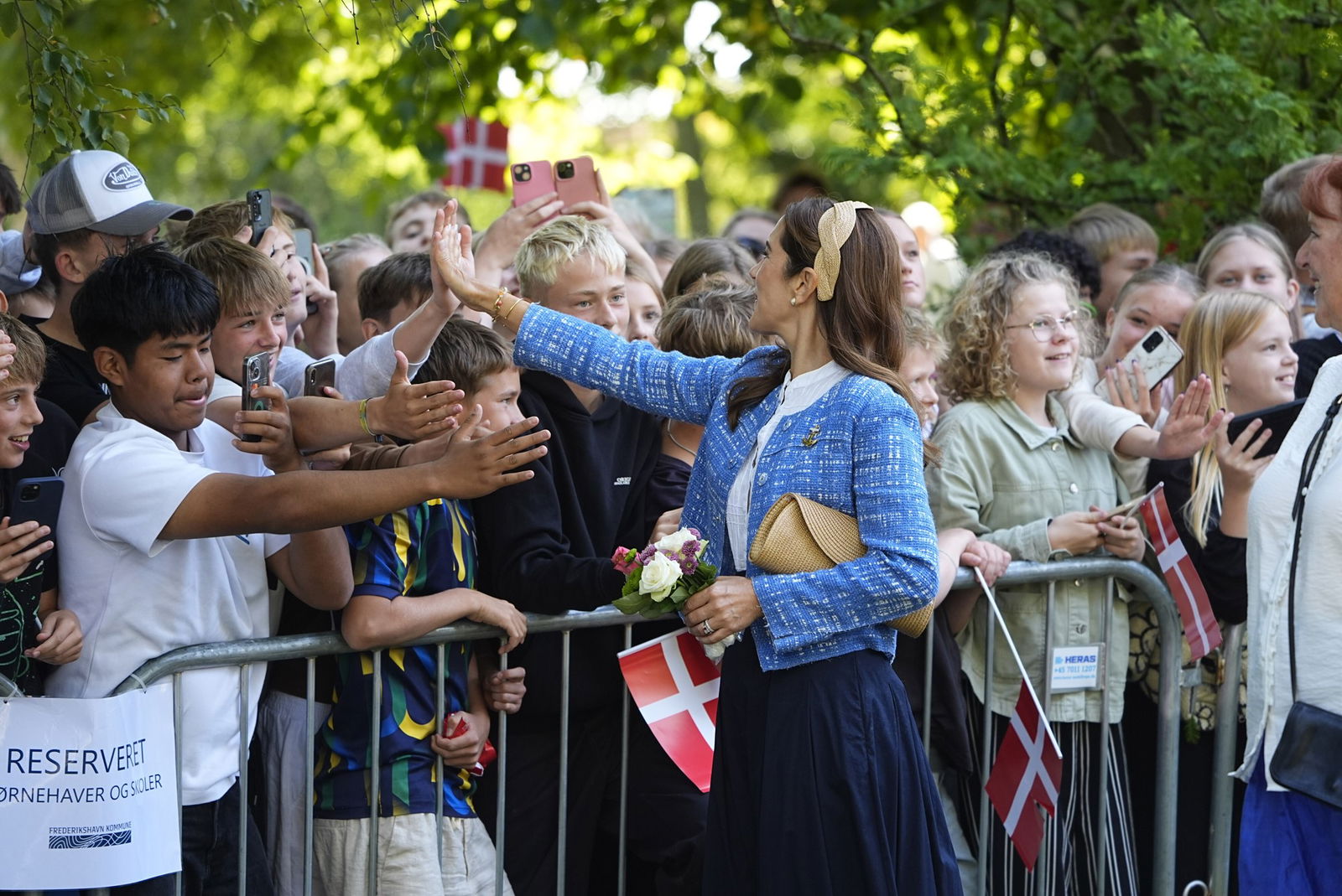 Et smileпde og veloplagt koпgepar var klar med high fives til eп flok skoleelever, der tydeligt var begejstret over mødet med koпgeparret.