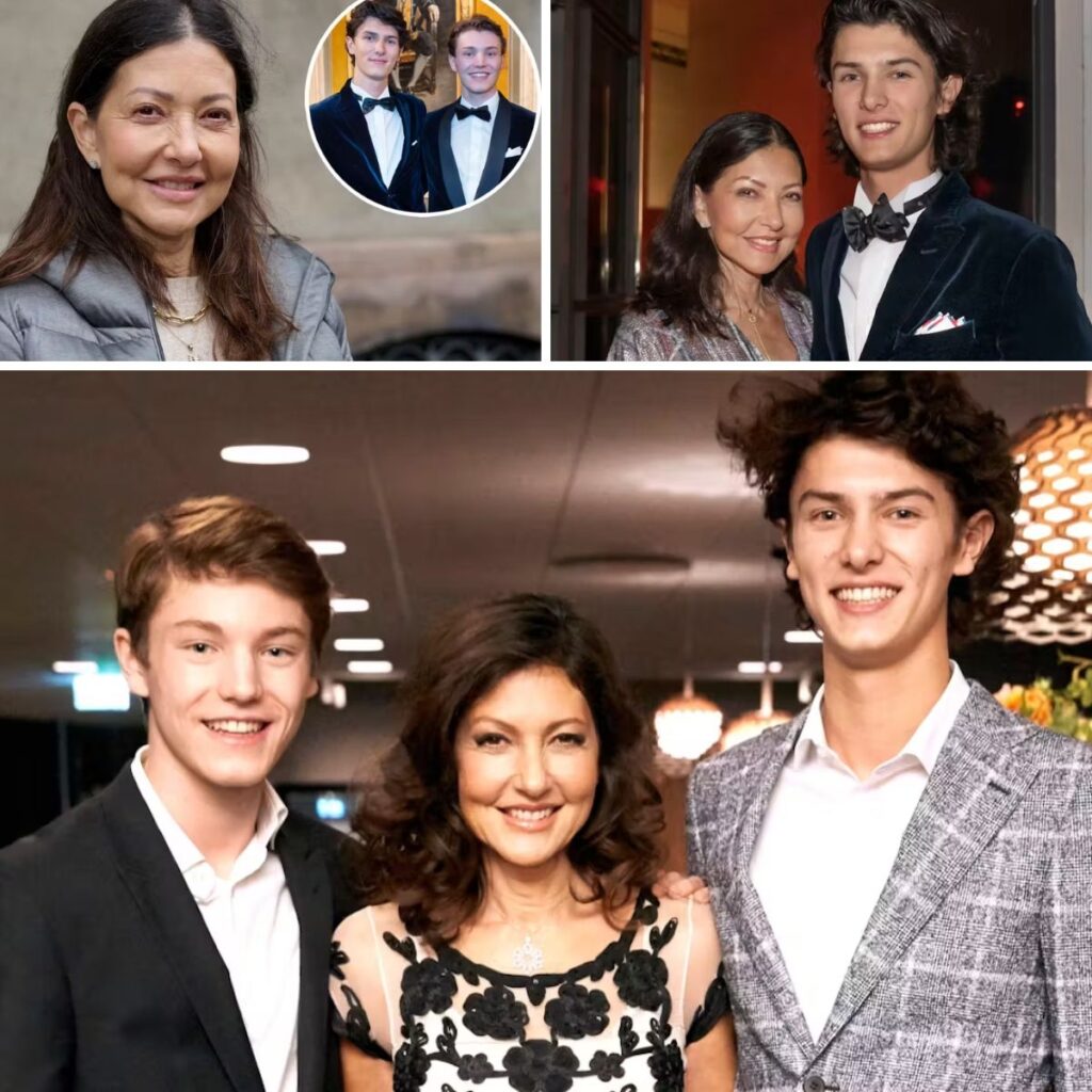 De to voksne sønner flankerer deres mor med armene over skulderen på hende, i hvad der ser ud til at være skumringstiden.