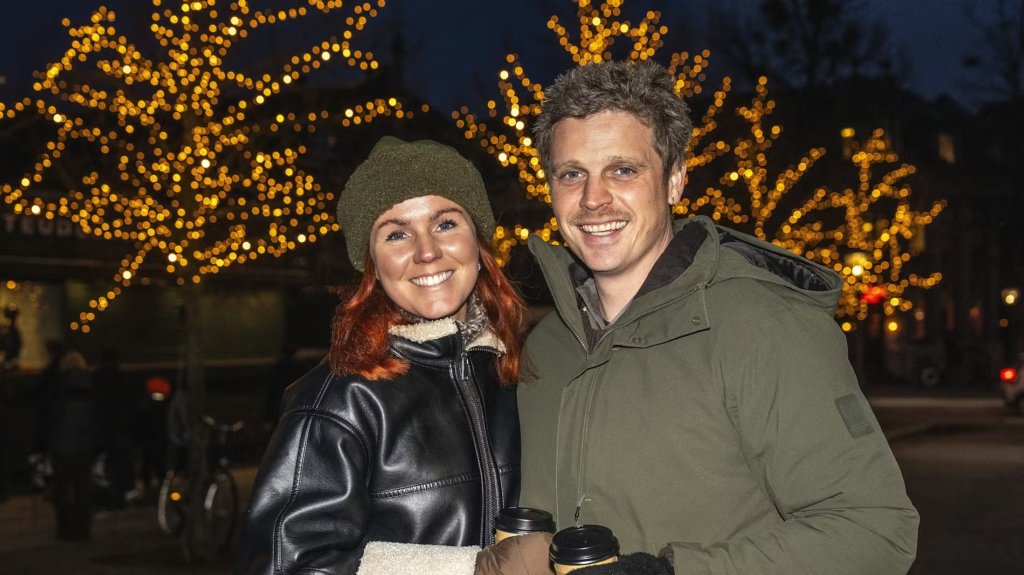 De stråler om kap med julelysene ved indgangen til Frederiksberg Have – Amalie Klæstrup Nielsen, 33, og Otto Olrik, 32, fra ”Gift ved første blik”.