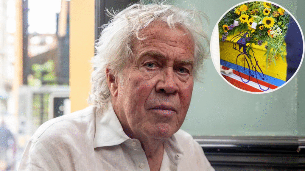 Jørgen Leths kiste er ankommet til kirken. Den er farvestrålende.
