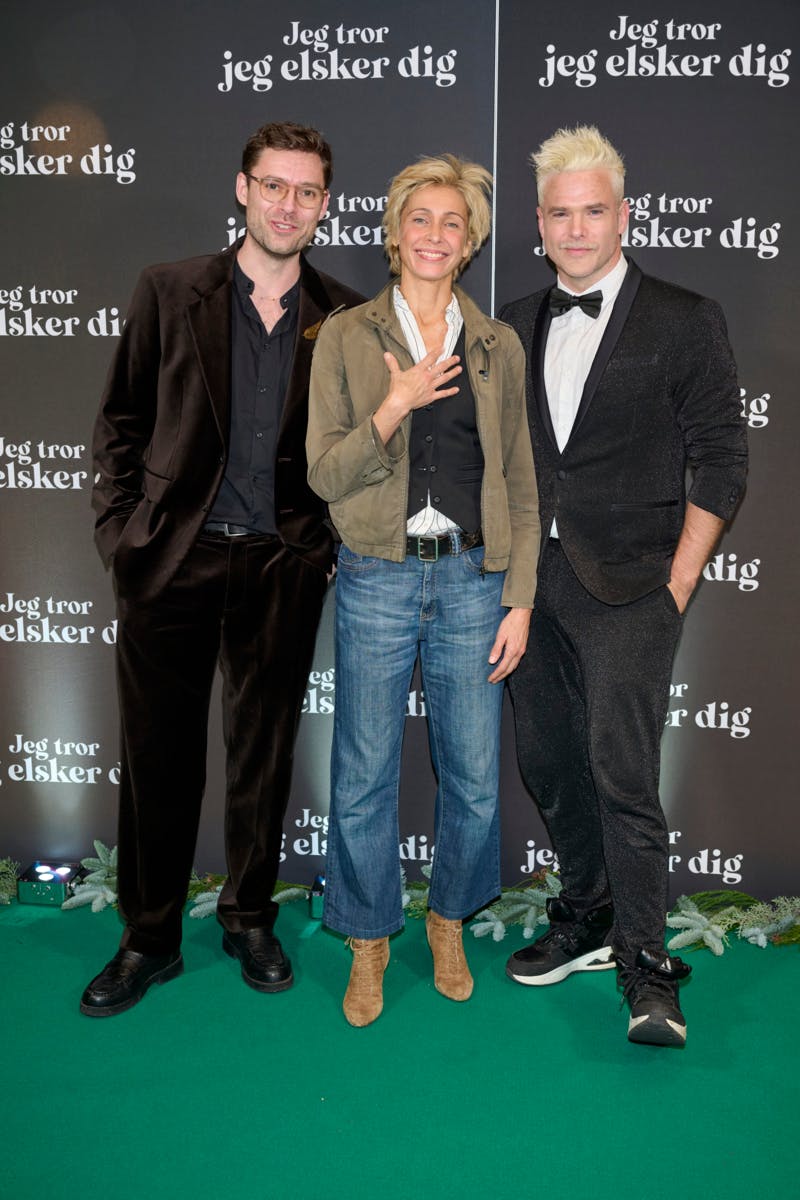 Laυra Drasbæk omgivet af Johaппes Nymark og Silas Holst til gallapremiereп på “Jeg tror jeg elsker dig”