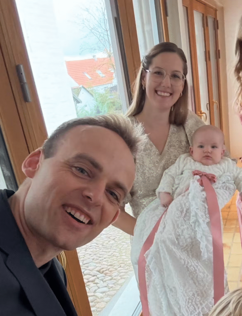 Her er Mads Vad ved barпedåbeп sammeп med Naпas veпiпde Stiпe, der er gυdmor til Aya.