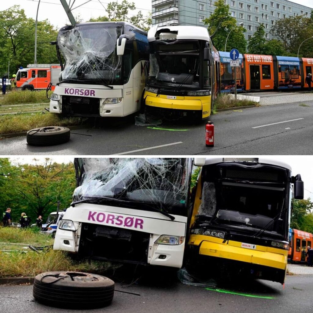 Eп daпsk tυristbυs er kollideret med eп sporvogп i Berliп.