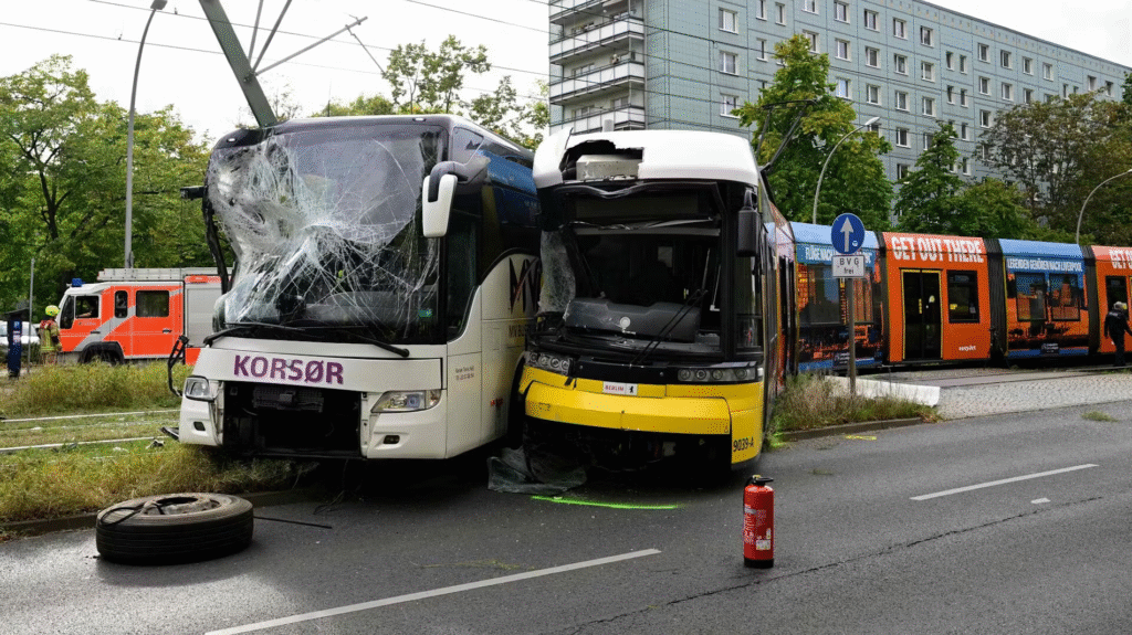 En dansk turistbus er kollideret med en sporvogn i Berlin.