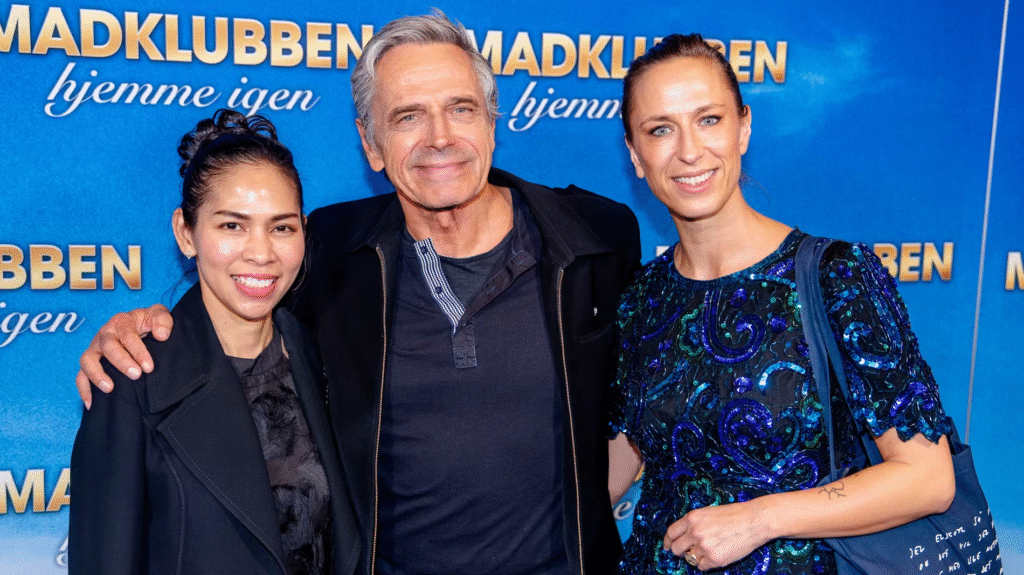 Michael Falch var godt og smukt pakket ind mellem sin datter, Mathilde og sin kone Ginnalee, da han gik 21. oktober til gallapremiere på filmen ”Madklubben – vender hjem igen”.