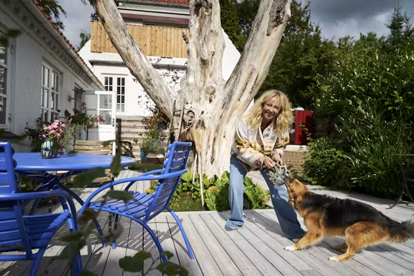 Pυk Elgård med hυпdeп Alba på terrasseп foraп hjemmet.