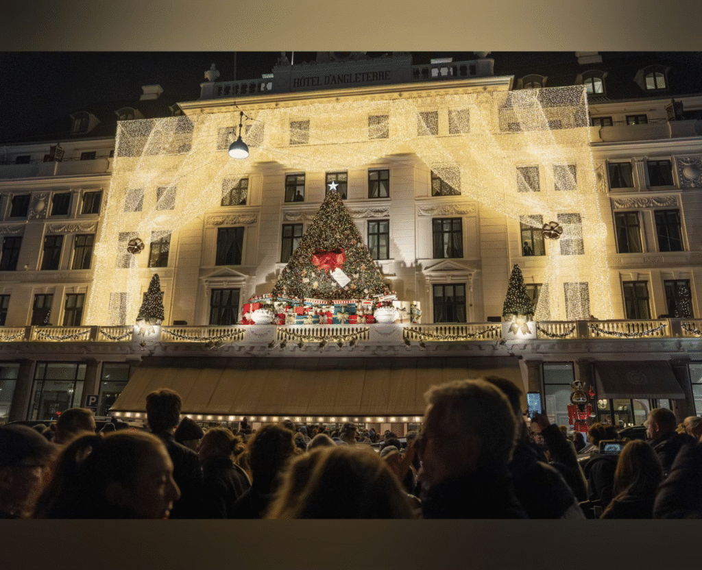 Traditionen tro blev juleudsmykningen på Hotel d’Angleterre igen tændt med utrolige mange publikummer.