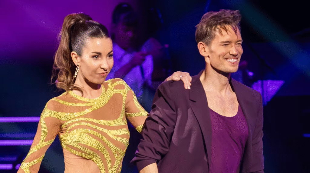 Morten Kjeldgaard og Frederik Hauns tvillinger jubler, da de i fjernsynet ser deres far danse med Julie Rudbæk.