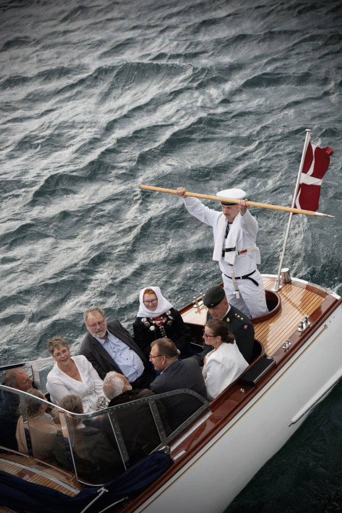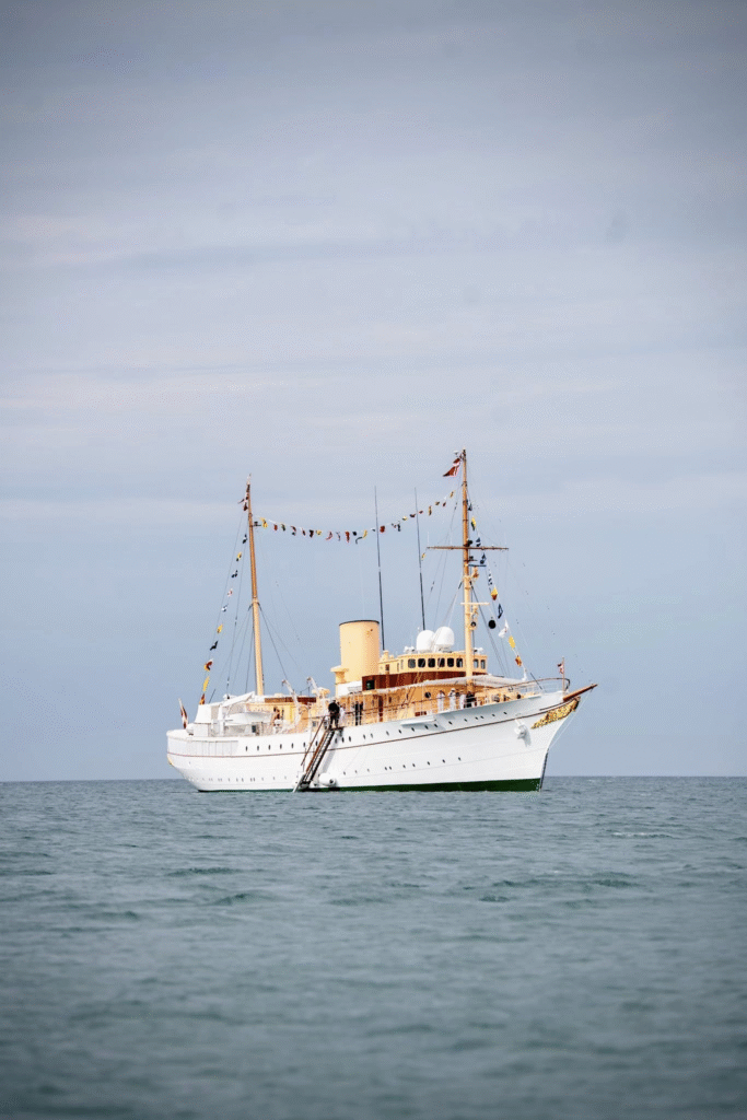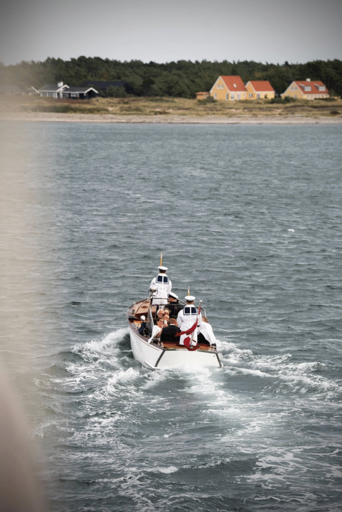 Ud for Østerby Havn lå Kongeskibet Dannebrog under besøget i Læsø Kommune, og som afslutning på dagen inviterede Deres Majestæter Kongen og Dronningen til Afternoon Tea. Gæsterne blev sejlet ud til skibet i chalupper og budt på små sandwich, jordbærkage, scones samt te og kaffe ☕️🧁