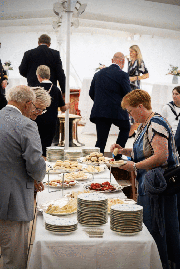 Ud for Østerby Havn lå Kongeskibet Dannebrog under besøget i Læsø Kommune, og som afslutning på dagen inviterede Deres Majestæter Kongen og Dronningen til Afternoon Tea.