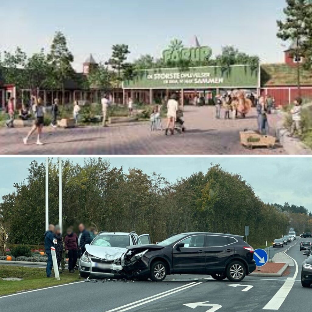 To biler er lørdag formiddag kørt sammen ved indkørslen til forlystelsesparken Fårup Sommerland.