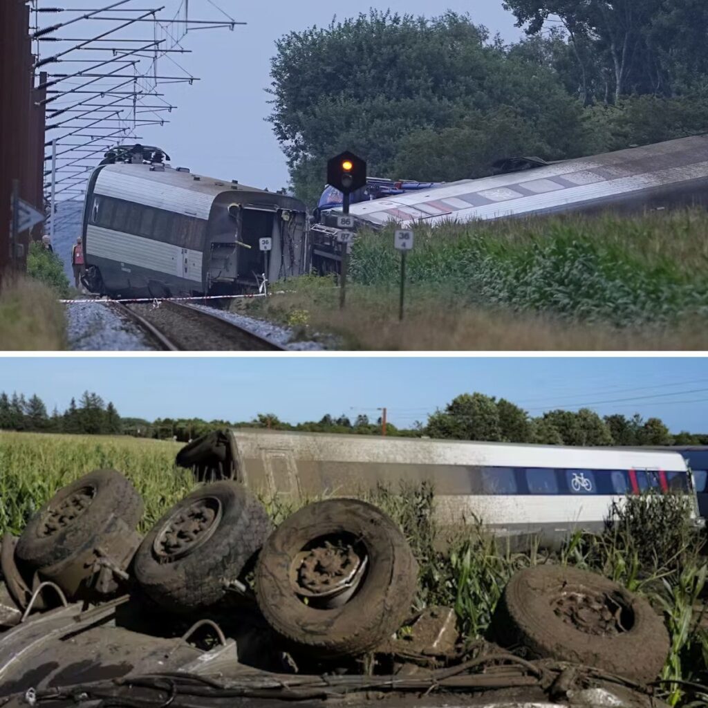 Toget kolliderede med en gylletransporter, og sammenstødet fik to af togvognene til at køre af sporet.