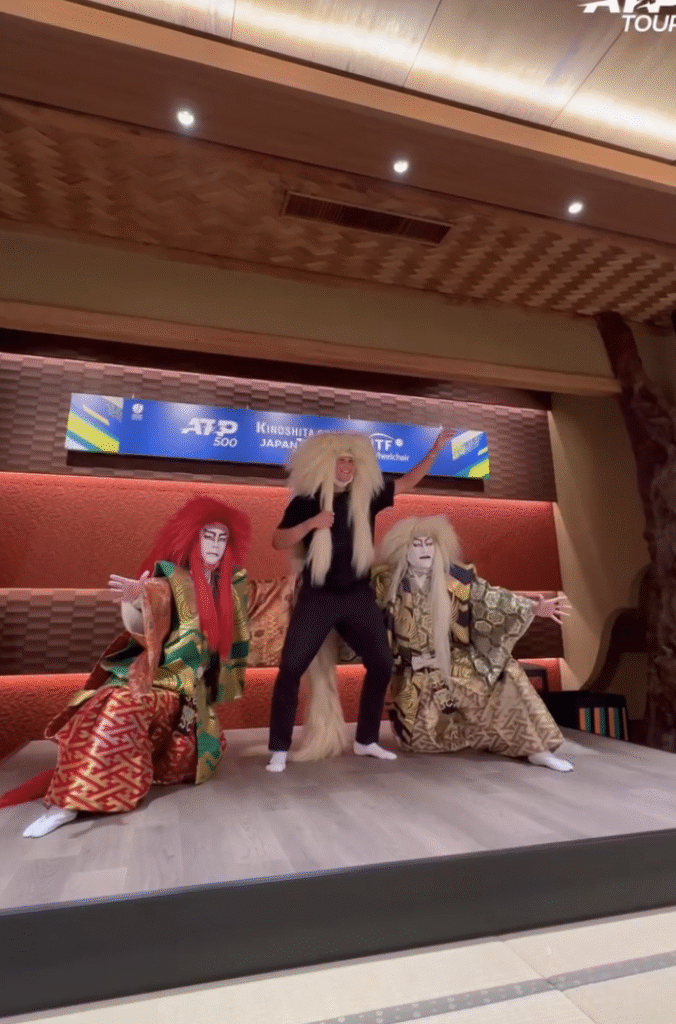 Til Tokyo Player Party deltog han i den traditionelle japanske dans Kabuki Dance Renjishi, hvor de medvirkende er iført lange manker.