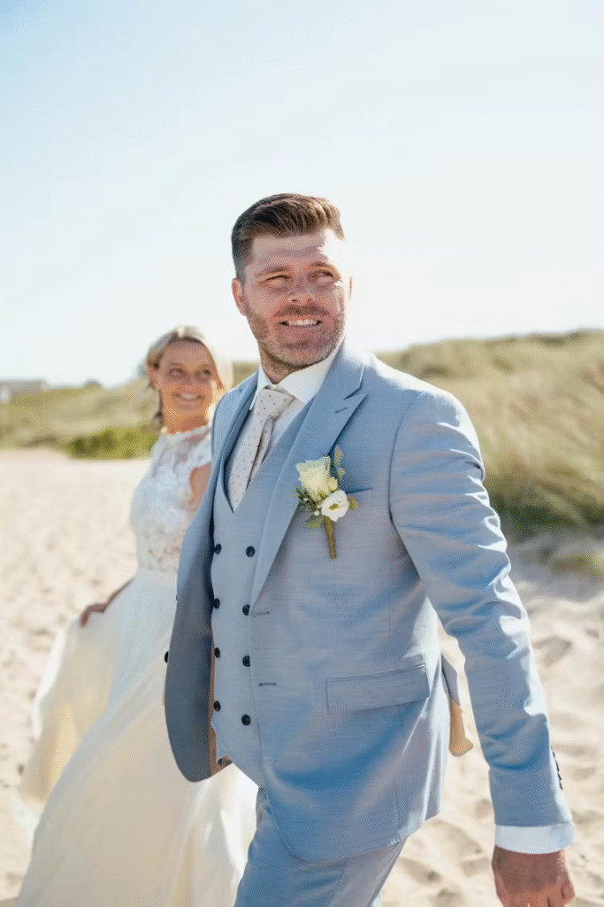 Glæden lyser ud af nygifte Jesper Olsen og hans hustru på billedet, der er taget på stranden med klitterne i baggrunden.